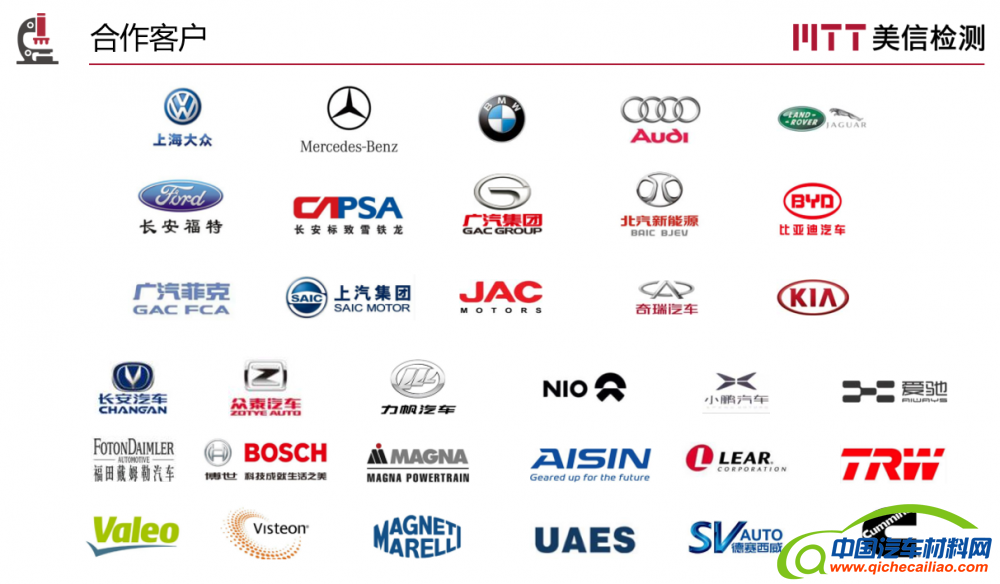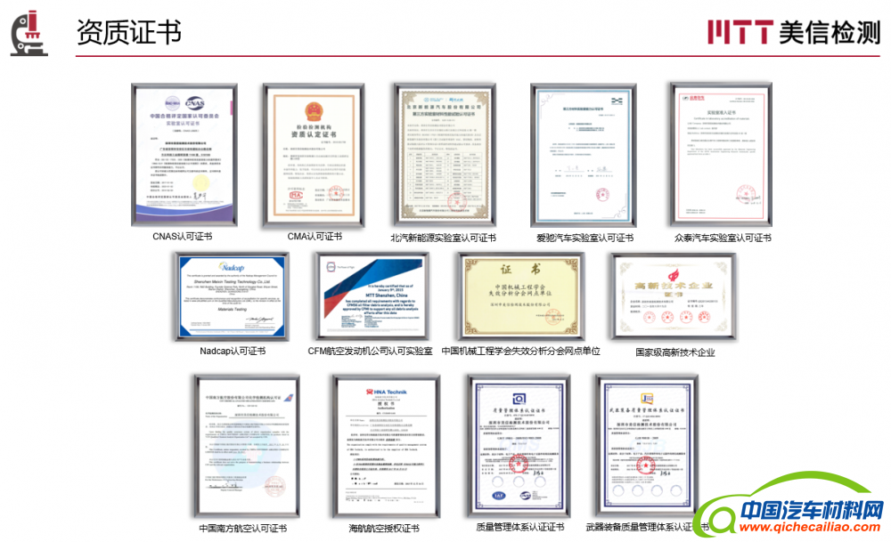 美信检测实验室已取得CNAS与CMA认可资质,在汽车材料及零部件检测领域已获得北汽新能源、爱驰、众泰等多家车企认证认可,助力车企进一步落实质量管控措施、确保各层级的试验符合相关体系的质量要求,切实对产品质量提供有效的技术保障。