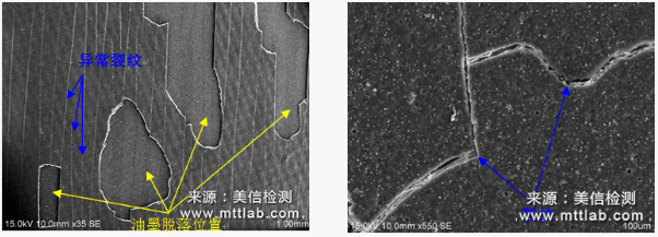 某品牌汽车仪表盘油墨层脱落,导致表盘透光不良。美信通过外观检查、百格试验、FTIR分析、表面SEM+EDS分析等手段对样品进行分析,确定了涂层脱落失效原因,为企业进一步提高产品质量提供有效助力。