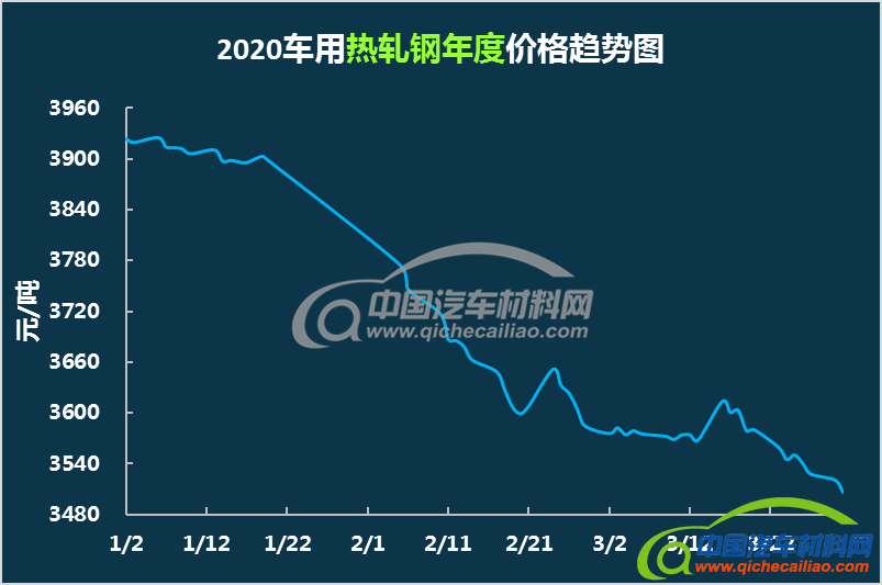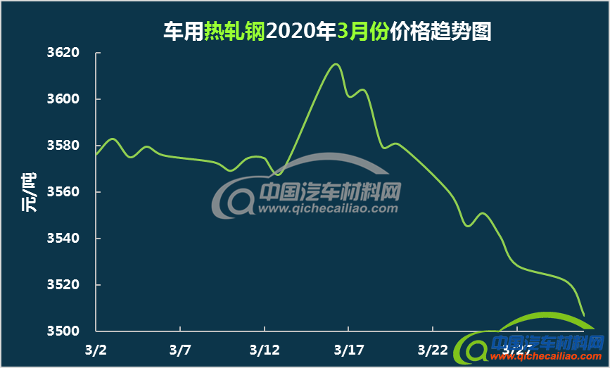 车用热轧钢3月份价格总体呈先上升后下降的趋势:3月2日-17日有小幅上涨;3月17日后呈持续下跌趋势。3月最高价为3614.09元/吨,最低价为3506.67元/吨,最大跌幅为2.97%。3月份热轧钢均价为3567.30元/吨,环比下跌2.42%,同比下跌10.09%。