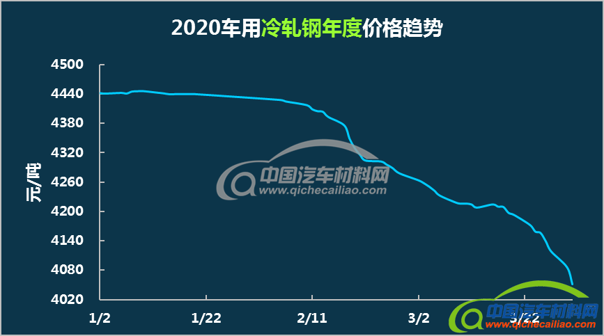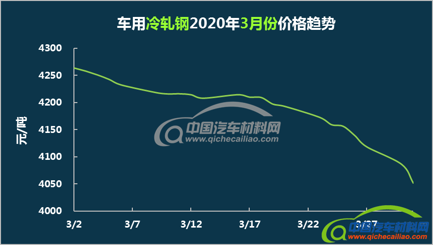 车用冷轧钢3月份价格整体有所下跌,3月最高价为4263.41元/吨,最低价为4051.67元/吨。3月份冷轧钢均价为4192.05元/吨,环比下跌3.68%,同比下跌5.25%。