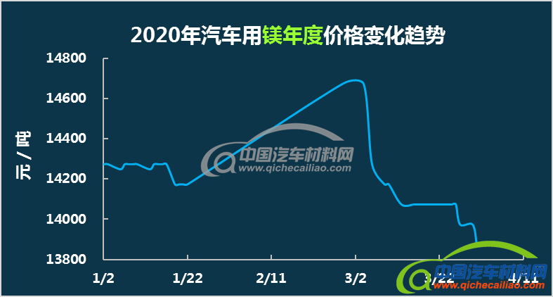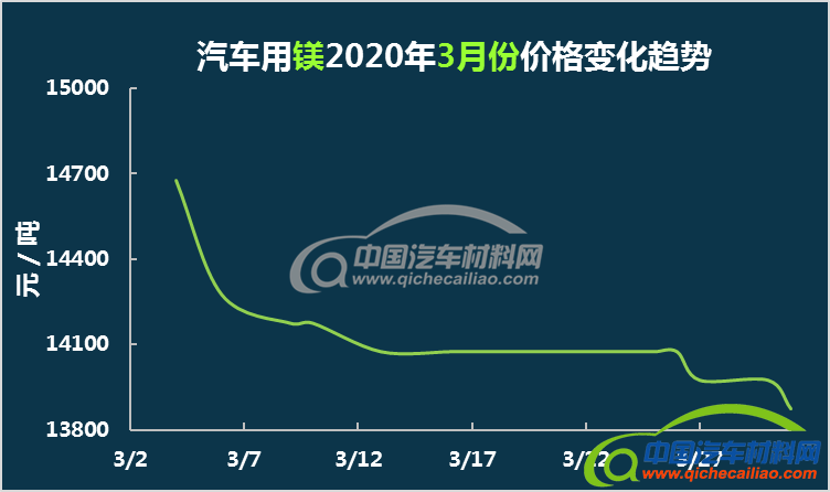 汽车用镁3月价格呈下跌趋势,为14675元/吨,最低价为13875元/吨,跌幅达800元/吨。3月份汽车用镁均价为14110.29元/吨,同比下跌18.98%。