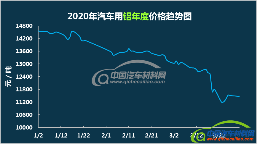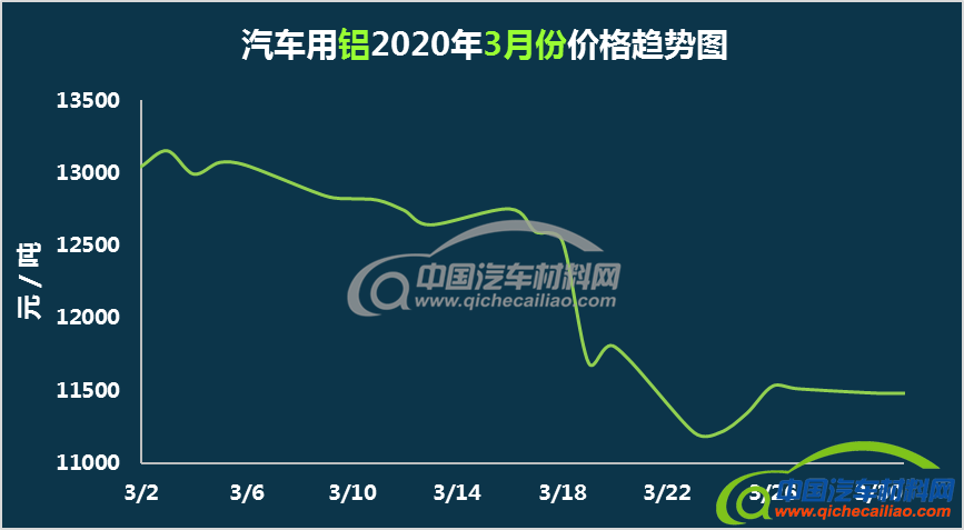 汽车用铝3月价格总体呈下跌趋势,月度最高价为13150元/吨,最低价为11210元/吨,最大跌幅为1940元/吨。3月份汽车用铝均价为12285元/吨,环比下跌9.12%,同比下跌11.03%。