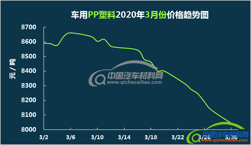 车用PP塑料3月份价格呈下跌趋势,本月最高价为8660.18元/吨,最低价为8032.02元/吨,最大跌幅为628.16元/吨。3月份PP塑料均价为8434.53元/吨,较上月下跌3.65%,较去年同期下跌16.32%。