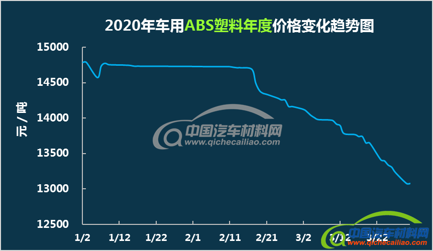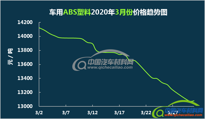 车用ABS塑料3月份价格呈持续下跌趋势,月度最高价为14123.64元/吨,最低价为13078.79元/吨,最大跌幅为1044.85元/吨。3月份ABS塑料均价为13689.17元/吨,环比下跌5.79%,较去年同期下跌12.36%。
