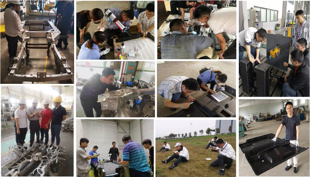 项目涉及8家零件制造单位,分布在全国各地,辽阳、顺义、常熟、湘潭、广州等地都留下了我们试制奋战的身影:新材料新工艺的首次应用不断挑战工艺极限,试模中成型、尺寸等问题不断,我们不畏艰苦,迎难而上。以铝合金连接件为例,我们先后进行7轮试模、近百次参数调节,只为将精度误差提升至1mm以内。尺寸工程师谯俊半年内累计出差达67天,他调侃道:“2019是飞行和常驻的一年”。