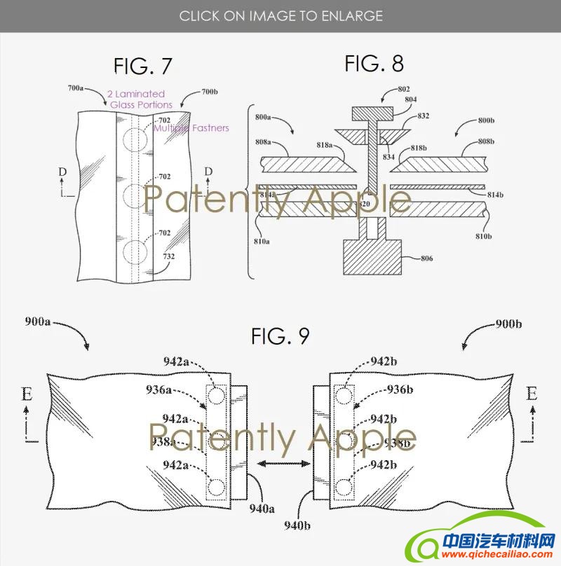 苹果专利图7展示了两部分夹层玻璃接合处的俯视图,其中还包括一种紧固系统;专利图8展示了专利图7中两部分夹层玻璃紧固件的剖面图;专利图9为两部分夹层玻璃密封接缝的俯视图,其中至少有一个部分可以移动。(文中图片均来自patentlyapple.com)