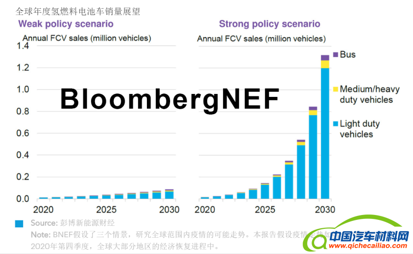 政策支持力度较强:2030年,氢燃料电池车年销量将超过130万辆,氢燃料电池车保有量超过350万辆。而BNEF预计2030年全球汽车保有量将达到17亿辆。强有力的政策情景下,需要更多国家效仿日本投资建设加氢基础设施或出台与欧盟2030年排放标准类似的法规,2020年至2030年补贴总额约1,050亿美元,其中57%为汽车补贴。