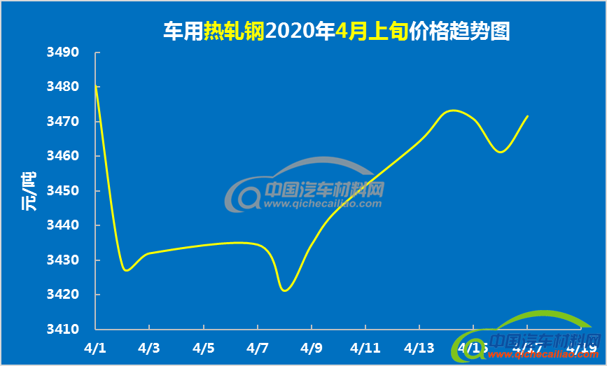 车用热轧钢4月上旬价格波动较大,先从4月1日的3480.42元/吨跌至2日的3428.33元/吨;随后价格趋于平稳,并有小幅回升。4月7-8日出现小幅度下跌,随后热轧钢价格快速回升,直至15日才又出现一个小幅度的波动。热轧钢在4月上旬的均价为3451.44元/吨,较上月均价下跌3.25%。