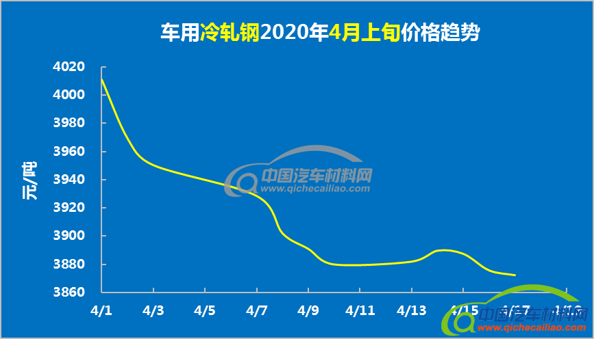 车用冷轧钢4月上旬价格整体呈下跌趋势,4月最高价为4010.91元/吨,最低价为3872.42元/吨。车用冷轧钢4月上旬均价为3911.66元/吨,较上月均价下跌6.69%。