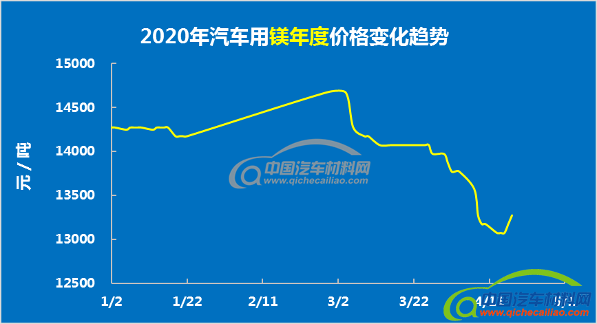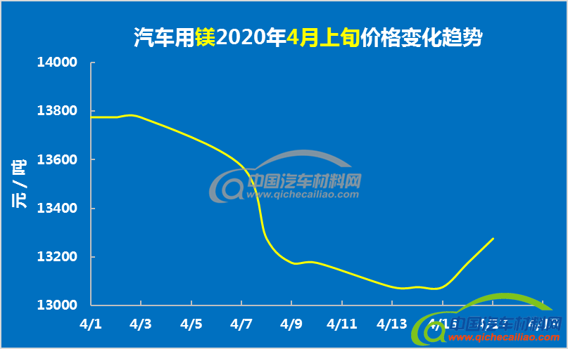 汽车用镁4月上旬价格先降后增,4月1日-15日,价格持续下跌,单日最大跌幅为200元/吨。4月15日以后,价格有所回升。汽车用镁4月上旬均价为13350元/吨,较3月均价下跌5.39%。