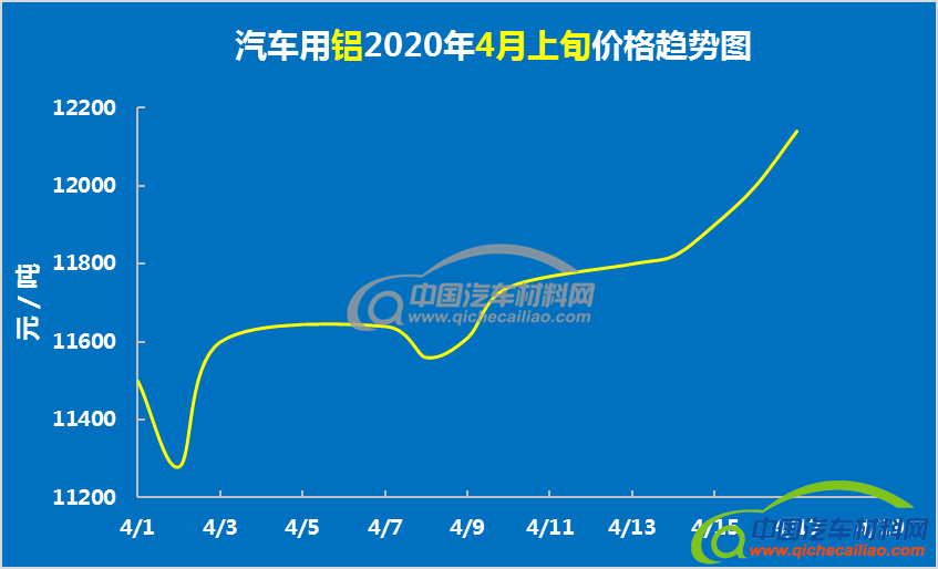 汽车用铝4月上旬价格总体呈上涨趋势。4月1日-2日价格有小幅下跌;2日-7日价格平稳上涨;7日-8日又有小幅下跌;8日以后持续快速上涨。汽车用铝4月上旬均价为11715.83元/吨,较3月份均价下跌4.63%。