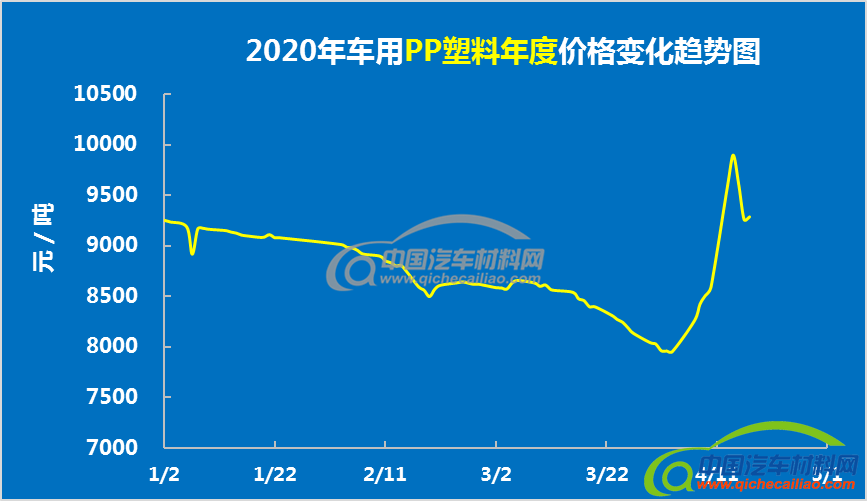 车用PP塑料4月上旬价格总体呈上升趋势,4月1日-14日价格持续上涨,最高价涨至9901.92元/吨;4月14日-16日价格有小幅回升。车用PP塑料4月上旬均价为8778.85元/吨,较3月均价上涨4.08%。