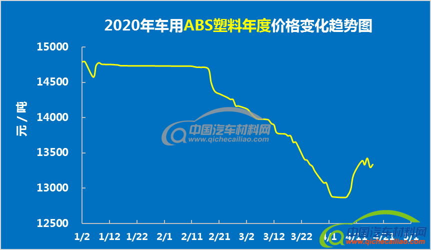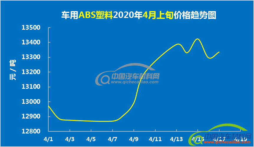 车用ABS塑料4月上旬价格总体呈上涨趋势,4月1日-7日价格有小幅下跌;4月7日-13日价格持续快速上涨;4月13日后价格开始有小幅波动。车用ABS塑料4月上旬均价为13123.06元/吨,较3月均价下跌4.14%。