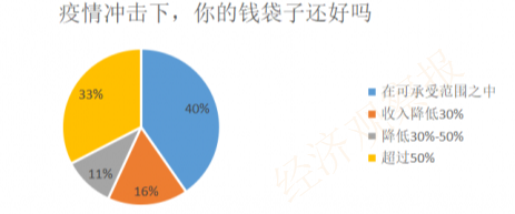 在此次联合调查中,消费者取消或延期购车的理由几乎全部指向收入的减少。在“疫情冲击下,你的钱袋子还好吗?”的问题中,有60%接受调查的网友表示自己的收入在疫情中受到影响,其中收入下降超过30%的人数占比达到49%;收入没有受到影响或者在可以承受范围中的有40%。这展现了一个很值得关注的现象:在疫情中收入受影响的现象出现极端分化,要么受影响很小,要么受影响很大,收入降低幅度在30%以内的非常少。