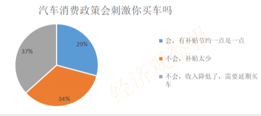在“汽车消费政策会刺激你买车吗”的问题中,收集到的1117份有效调查显示了刺激政策真实的效果。其中,34%的受调查者表示自己购车没有受到政策“刺激”,29%消费者表示会受到政策影响,剩余的37%则受到收入减少的影响而出现了消费降级或者是延迟购车的情况。另外,还有一部分因素并未出现在我们调查问卷中,这主要是在一线城市的限购问题。