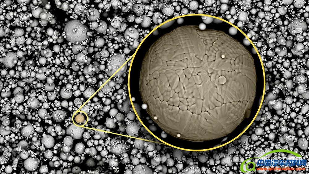 △用于3D打印的马氏体钢粉。插图显示了钢粉的放大视图。