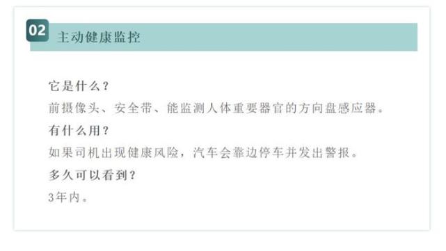 把你的车远程召唤到一家店面前,它几分钟内就能到达。然后汽车会扫脸,打开车门。系好安全带后,它开始检查你的生命体征,并在控制面板上显示健康状况。开始驾驶时,挡风玻璃上会出现一个通知,提示你几秒钟前刚发生的一起撞车事故。未来几年,这种高科技车型可能会出现在普通消费者家里。