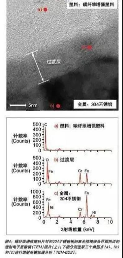 图4是接头界面附近的透射电子显微镜(TEM)照片,从PA基体、不锈钢上的氧化膜、不锈钢基体中分别选取典型的点来进行透射电镜能谱分析(TEM-EDS)。我们可以观察到,碳纤维增强塑料从原子或分子尺度上被连接在304不锈钢的10纳米厚的铬铁(Cr-Fe)氧化层上。这表明,化学键合和物理(范德华力)粘结的可能性很高。因此,碳纤维增强塑料和304不锈钢能被牢固地接合在一起形成强而有力的接头。