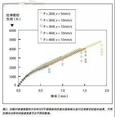 图2显示了在不同碟片激光辐照条件下对接头进行拉伸剪切试验的结果。结果表明,接头的最大拉伸剪切负荷(强度)约为4800N(20mm宽的碳纤维增强塑料),这一结果是在功率为2kW和5mm/s的试验速度的情况下得出,高于碳纤维增强塑料板的拉伸剪切负荷的一半。30mm宽、3mm厚的PA塑料片材与304不锈钢板之间接头的拉伸剪切负荷最大约为3400N。从中我们可以判断,20mm宽的碳纤维增强塑料和304不锈钢板之间接头的最大负荷要远高于30mm宽的PA塑料片材与钢板间的接头。因此,通过在具有更长碳纤维的聚丙烯腈(PAN)型PA基材碳纤维增强塑料片材和304不锈钢板之间形成搭接接头,可以得到最高的负荷。
