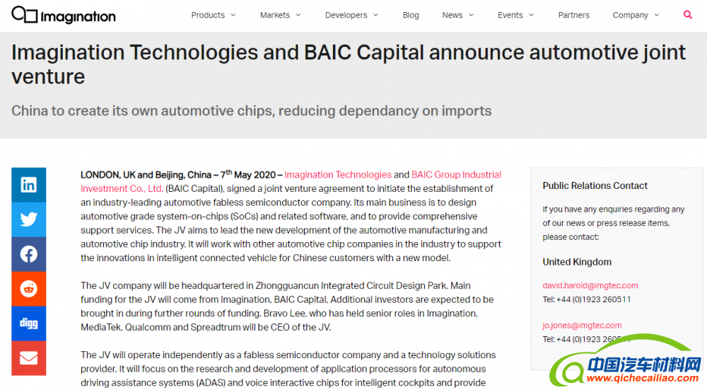 Imagination因其在汽车领域的悠久历史和专业知识入选为北汽合资企业。如今,许多领先的汽车半导体供应商都在使用Imagination的IP,从而使其在汽车应用处理器领域的市场份额超过50%。北汽集团是中国领先的汽车原始设备制造商(OEM),同时也是中国第四大汽车整车厂。