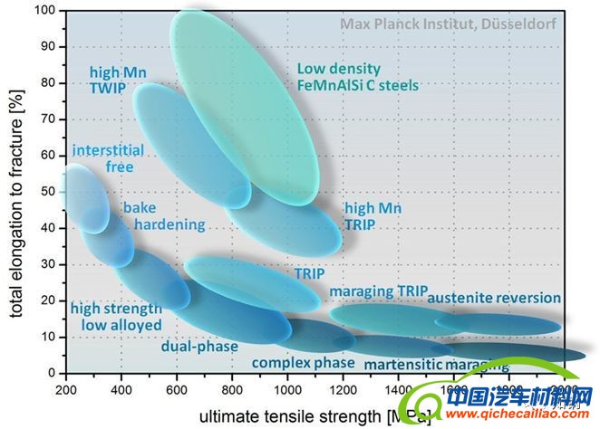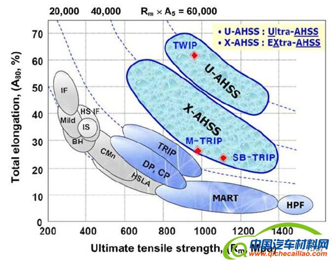 先进高强度钢板主要指以相变强化为主要强化方式的一类钢板,包括双相钢(Dual Phase Steel,DP)、相变诱发塑性钢(Transformation Induced Plasticity Steel,TRIP)、孪晶诱发塑性钢(Twinning Induced Plasticity Steel,TWIP)、复相钢(Complex Phase Steel,CP)和马氏体钢(Martensitic Steel,MS)等,如下图所示。此外,还有热冲压用钢(HPF)、低密度高强钢(High Specific Strength Steel)等。使用AHSS的目的,主要是降低车身重量,提高结构安全性,减少温室气体的排放。