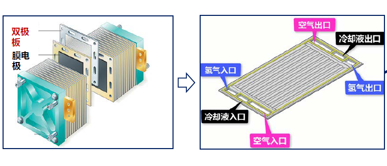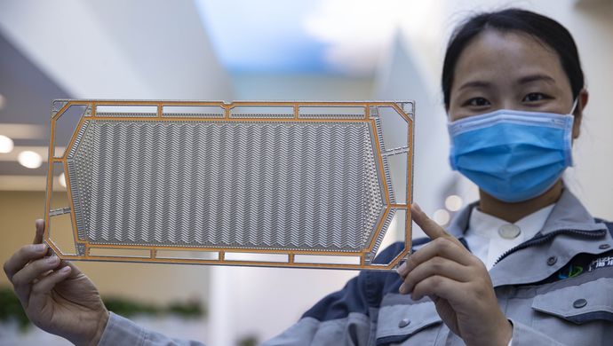 如何实现我国氢能蓝图、打造上海产业高地?研发燃料电池的关键核心技术是必由之路。作为核心部件,双极板占电堆体积的80%,承载着氢气场、氧气场、冷却液流场“三场”的传输和导电功能。在厚度仅为1毫米左右的金属双极板上,分布着密密麻麻的流道,精度达到微米级,氢气、氧气、冷却液就在这些流道里传输,发生奇妙的电化学反应。近年来,日本、欧洲企业研制出钛合金双极板,取代了传统的石墨双极板。如果中国企业无法制造这种部件,国内汽车企业就只能依赖进口。