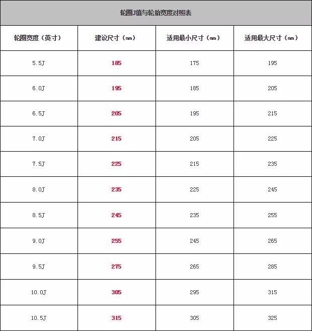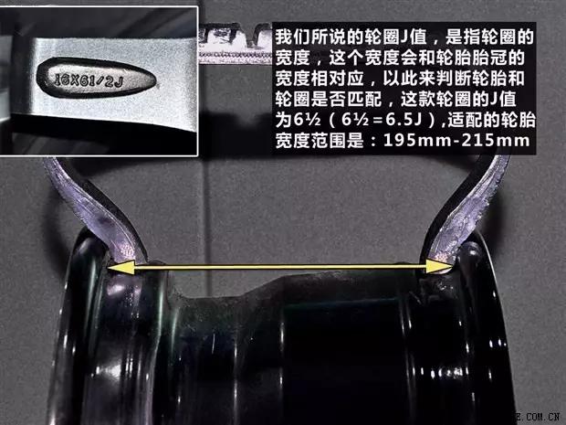 轮毂的J值有一个对应的表格,例如上图写着16x61/2J(16x6.5J),对照表格,轮毂的宽度选择范围(195-215),选择205为最佳!