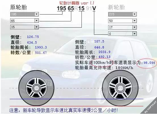 不同的轮胎宽度、扁平比、轮毂半径,对应的轮胎直径不同,角速度相同的情况下,轮胎行驶速度和仪表台显示数字就会产生偏差!