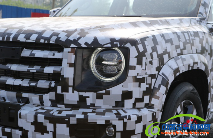车头中网由三道粗壮饰条组成,配合极具辨识度的圆形复古式大灯,粗犷大气而又不失潮流惊艳,再搭配大面积的突出式越野前杠,展现出了一种沉稳而又压迫的力量感。