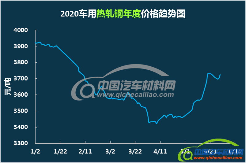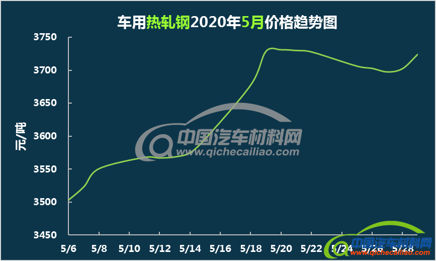 车用热轧钢5月份价格总体呈先上涨趋势:5月6日-20日持续上涨,最高涨至3731.67元/吨;5月20日-27日价格有小幅下跌,27-28日价格再次小幅回升。5月份热轧钢平均价格为3643.65元/吨,环比上涨5.37%,同比下跌10.72%。