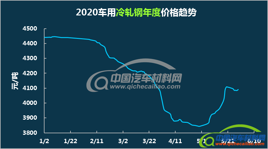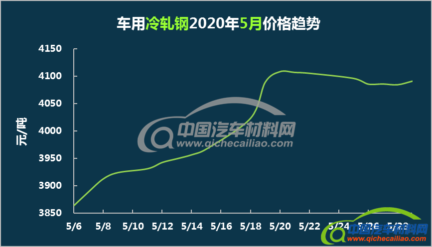 车用冷轧钢5月份价格总体呈上升趋势:5月6日-20日价格持续上涨,最高价涨至4108.22元/吨;5月21日以后价格有小幅回落。5月份车用冷轧钢均价为4011.24元/吨,环比上涨3.23%,同比下跌8.31%。