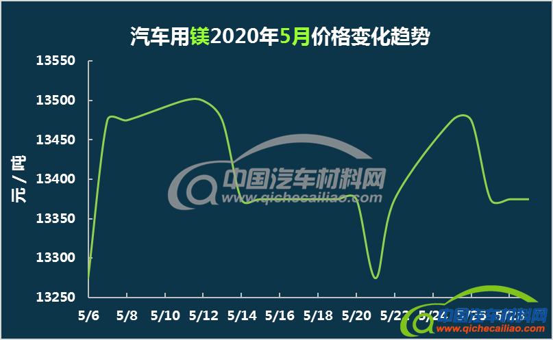 汽车用镁5月价格波动较大,5月6日-12日价格上涨,最高达到13500元/吨;5月12日-21日价格下跌,最低跌至13275元/吨;5月21日-26日又回升至较高价位;26-29日价格再次下跌。汽车用镁5月均价为13405.56元/吨,环比上涨0.68%,同比下跌21.01%。