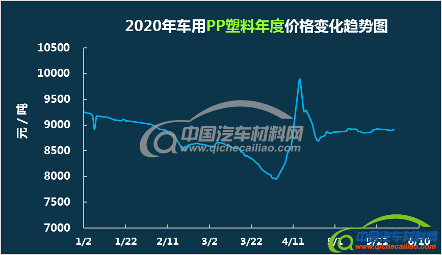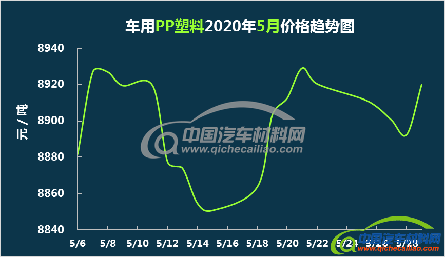 车用PP塑料5月份价格波动较大,5月6日-8日上涨;8日-15日大幅下跌;15日-21日再次大幅上涨;21日后出现新一轮下跌。5月份PP塑料均价为8899.60元/吨,较上月上涨1.12%,较去年同期下跌9.58%。