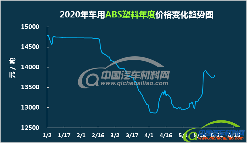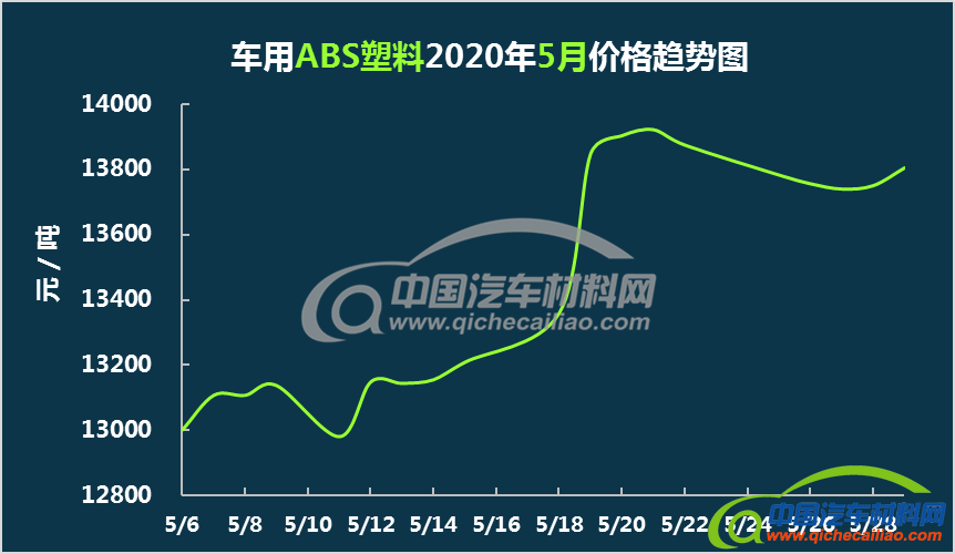 车用ABS塑料5月份总体呈先上涨后下跌的趋势:5月6日-21日,价格总体上升,最高涨至13920.59元/吨;5月22日后价格出现了较小幅度的回落。5月份ABS塑料均价为13459.06元/吨,环比上涨2.88%,较去年同期下跌11.61%。