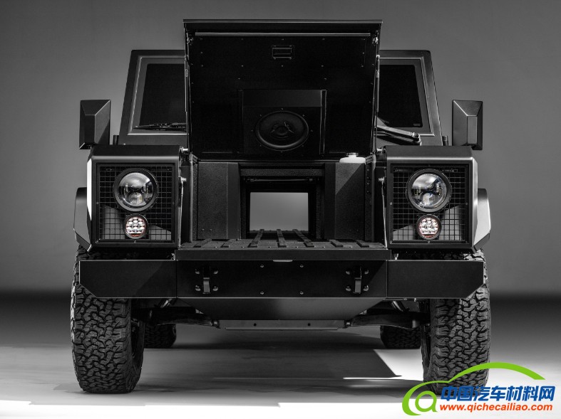 此外,可以从前座打开乘客座舱上锁的车门。Bollinger表示,两款卡车前行李箱的总储物空间尺寸为8.6立方英尺,配备4个电源插座,是一个可储物以及为电动工具充电的理想空间。