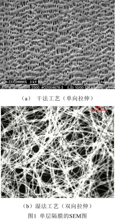 由图1可以清晰看到干法与湿法制得的电池隔膜的表面形态、孔径和分布都有很大的不同。湿法工艺可以得到复杂的三维纤维状结构的孔,孔的曲折度相对较高,而干法工艺是拉伸成孔,因此空隙狭长,成扁圆形,孔曲折度较低。