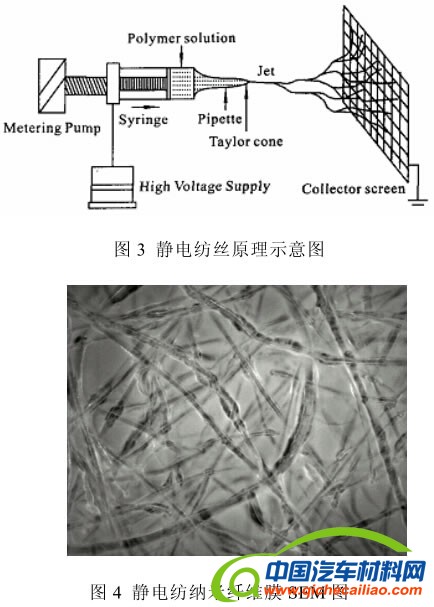 近年来,纳米纤维膜的制备技术受到广泛关注,而静电纺丝是最为重要的方法,但在解决单喷头静电纺丝的局限、纳米丝之间不黏结和薄膜力学性能低等关键技术方面有待突破。中科院理化技术研究所经过多年的努力,在静电纺丝制备纳米纤维锂离子电池隔膜项目上取得了突破性的进展。研制了多点多喷头静电纺丝设备,开发具有生产价值的制备技术,掌握了纳米纤维膜孔隙率控制技术。同时将纳米纤维隔膜装配的锂离子电池与用进口PE、PP隔膜装配的电池相比,其循环性能得到提高,热稳定性得到了明显改善,在14C放电条件下,纳米纤维隔膜电池的能量保持率在75%~80%之间,而进口PE/PP隔膜电池的能量保持率仅为15%~20%。图3为静电纺丝原理示意图,图4为静电纺纳米纤维膜SEM图。