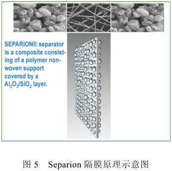 在新型锂离子电池隔膜的研究中,德国德固赛公司结合有机物的柔性和无机物良好热稳定性的特点,生产的商品名为Separion的隔膜占据了先机,已批量生产,其制备方法是在纤维素无纺布上复合Al2O3或其他无机物,见图5。Separion隔膜熔融温度可达到230℃,在200℃下不会发生热收缩,具有较高的热稳定性,且在充放电过程中,即使有机物底膜发生熔化,无机涂层仍然能够保持隔膜的完整性,防止大面积正/负极短路现象的出现,提高电池的安全性。