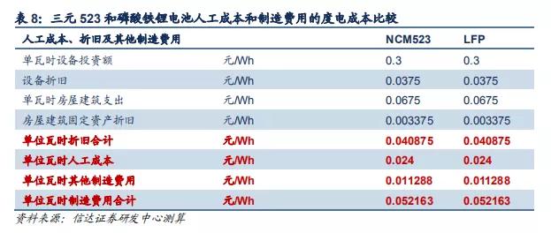 动力电池生产成本包括人工成本和制造费用,制造费用其中有包括设备和房屋建筑折旧及其他制造费用。我们假设 1GWh 产 能设备投资价值 3 亿元,人工 400 人,每年工作 300 天,每天工作 8 小时,人工小时数为 960000 小时/年,工时费 25 元/时, 对应 2400 万元/年,得出人工成本 24 元/KWh;设备折旧年限为 8 年,年折旧率为 12.5%,得出设备折旧 37.5 元/KWh;单 GW 产线占地面积 4500 平方米,房屋建筑固定资产支出 15000 元/平方米,折旧年限为 20 年,年折旧率 5%,得出房屋建筑 固定资产折旧为 3.38 元/KWh。整体上,我们测算得出三元 523 和磷酸铁锂电池人工的度电成本分别均为 24 元/KWh,折旧 对应的度电成本分别均为 40.88 元/KWh,其他制造费用对应的度电成本分别均为 11.29 元/KWh。