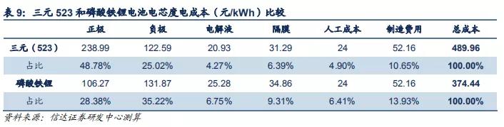 仅考虑电芯的情况下,三元 523 和磷酸铁锂电芯的度电成本分别为 486.96 和 374.44 元/kWh。