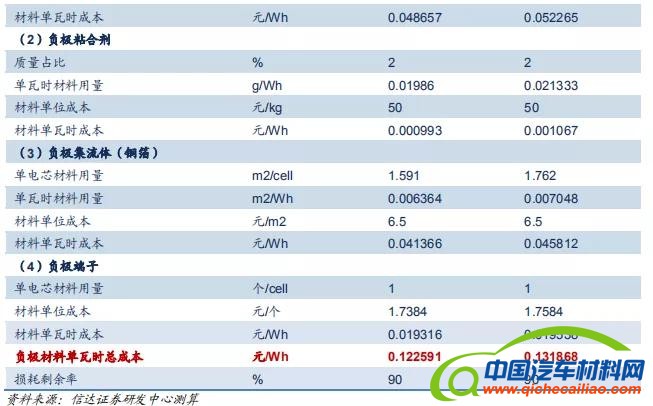 负极材料包括负极活性材料、负极粘合剂、负极集流体(铜箔)和负极组件负极端子。据我们测算,目前三元 523 负极活性 材料、粘合剂、铜箔、负极端子度电成本分别为 48.66、0.99、41.37、19.32 元/kWh,磷酸铁锂电池分别为 52.27、1.07、 45.81、19.54 元/kWh,负极材料中活性材料、铜箔和负极端子成本占比较高,粘合剂占比较低。考虑到材料损耗,我们测算 得出三元 523 负极材料度电总成本为 122.59 元/ kWh,磷酸铁锂负极材料度电总成本为 131.87 元/ kWh。由于能量密度的不 同以及其他材料接近的原因,磷酸铁锂电池的负极材料成本高于三元电池。
