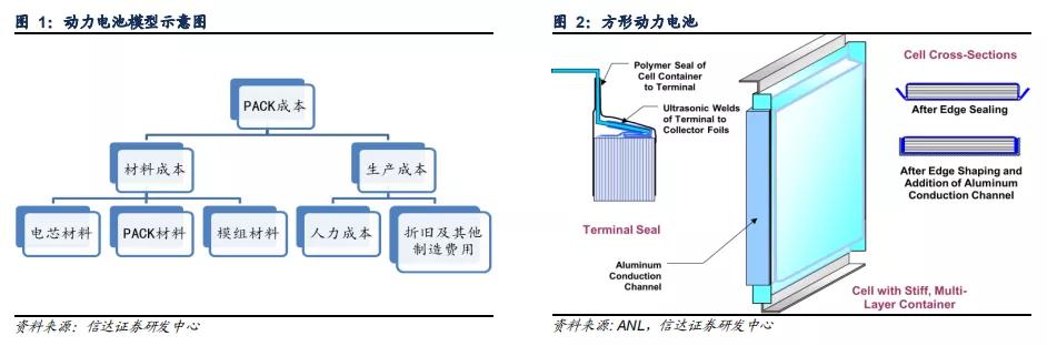 【电池材料】锂电池根据应用领域的不同分为动力电池、储能电池和消费电子电池,不同类型锂电池的成本构成自然不同,本篇报告主要 讲述应用最广泛的动力电池成本结构。动力电池在不同的正负极材料下其成本有一定差别,整体来看材料成本占比较大,人 工成本、折旧及其他制造费用占比较小,而材料成本则主要以正负极材料、隔膜、电解液和组件为主。 我们在动力电池成本模型里将 PACK 成本拆分成材料成本和生产成本,其中材料成本又包括电芯材料、模组材料及 PACK 材 料,生产成本包括人力成本、折旧及其他制造费用。我们参考 ANL 的成本测算模型,选取方形电池进行成本拆分。