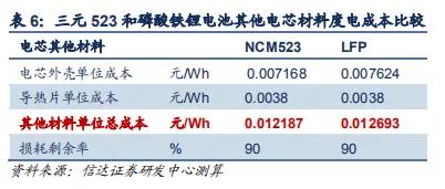 除以上外,电芯其他成本主要还包括外壳和导热片,整体占比较低。三元 523 和磷酸铁锂电池其他电芯材料的度电成本分别 为 12.18 和 12.69 元/ kWh。
