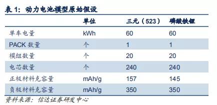 我们假设单车带电量 60kWh,包括 1 个电池包,20 个模组和 240 个电芯,以上假设主要用于测算模组和 PACK 组件成本。 我们选取三元动力锂电池 523 型和磷酸铁锂电池作为研究对象进行分析比较。参考当升科技公告数据,我们假设三元(523) 正极材料实际克容量为 157mAh/g。参考国轩高科和丰元股份公告数据,目前国内磷酸铁锂正极材料实际克容量基本已经达到 150mAh/g,我们取 145mAh/g 的平均水平作为磷酸铁锂正极材料实际克容量假设。参考杉杉股份公告数据,我们假设负极活 性材料(人造石墨)实际克容量为 350 mAh/g。