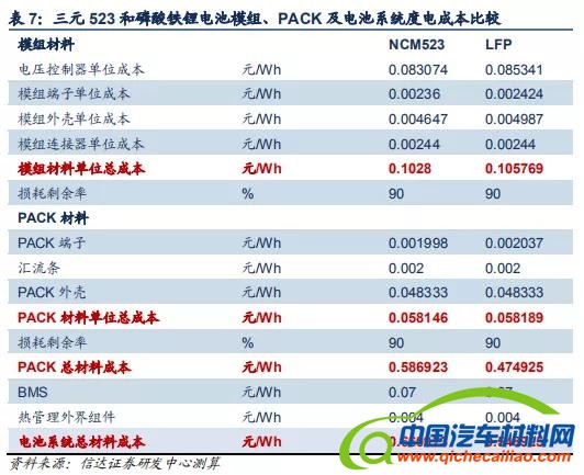 按照工艺顺序电芯之后是模组和 PACK,其中模组材料包括电压控制器、模组端子、模组外壳以及模组连接器,PACK 材料主 要包括 PACK 端子、汇流条和 PACK 外壳。据我们测算,三元 523 电池的模组材料和 PACK 材料度电成本分别为 102.8 和 58.15 元/ kWh,磷酸铁锂的分别为 105.77 和 58.19 元/ kWh。至此,我们已完成 PACK 总材料成本的测算,经加总后得出三 元 523 和磷酸铁锂的 PACK 所有材料的总度电成本分别为 586.92 和 474.93 元/ kWh。考虑电池管理系统和热管理组件成本 的情况下,我们测算得出目前三元 523 和磷酸铁锂电池系统材料总度电成本分别为 660.92 和 548.93 元/ kWh。