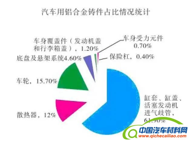 ⑥其他:减震器下端盖、压缩机支架、离合器踏板及刹车踏板等。下图所示为汽车用铝合金压铸件汇总及占比示意图。由图可知,目前压铸铝合金已在汽车行业得到了大范围的应用。