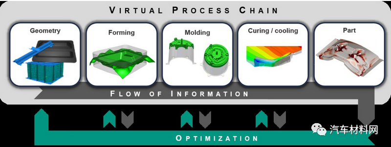为了充分利用SMC轻量化解决方案的潜力,采用合适的仿真设计和优化方法是必不可少的。与此同时,制造过程会显著影响产品中纤维取向等结构,进而影响产品的性能。因此,有效的仿真设计还需要一个对实际制造过程的数字化映射系统(digital twin),也需要一个虚拟的工艺过程链,这可以为后续的进一步仿真方法,如翘曲变形仿真、结构仿真等保留制造过程对于产品性能的影响。不过,之前的学术模型过于复杂,导致无法生成有效的材料卡片用于工业化产品的结构仿真当中。而且,他们还没有足够成熟的技术来清晰描绘不同的工艺制造过程来满足最小精度和最大数值效率的要求。
