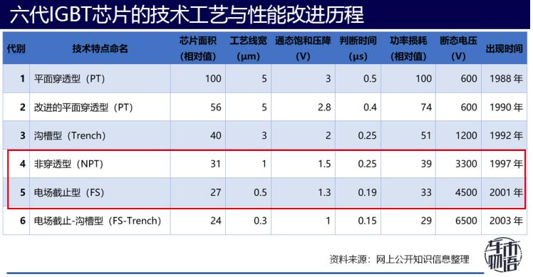 芯片,大家都爱说第几代技术,代数越高水平也越高。对于芯片工艺水平的代数划分,没有一定之规,对比一个比较被广泛采纳的划代标准,可以发现比亚迪IGBT芯片整体还是处于第4代,近两年开始试图在第5代、甚至第6代技术上有所突破。
