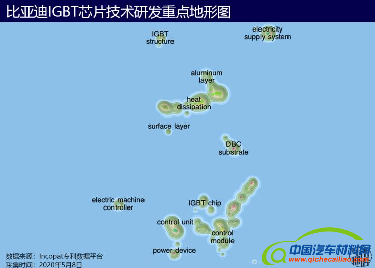 借助于incoPat专利数据平台,我们将比亚迪IGBT专利数据进行文本聚类,绘制了一份技术研发重点专利地形图,图中深色等高线部分表示比亚迪专利技术研发密集区。