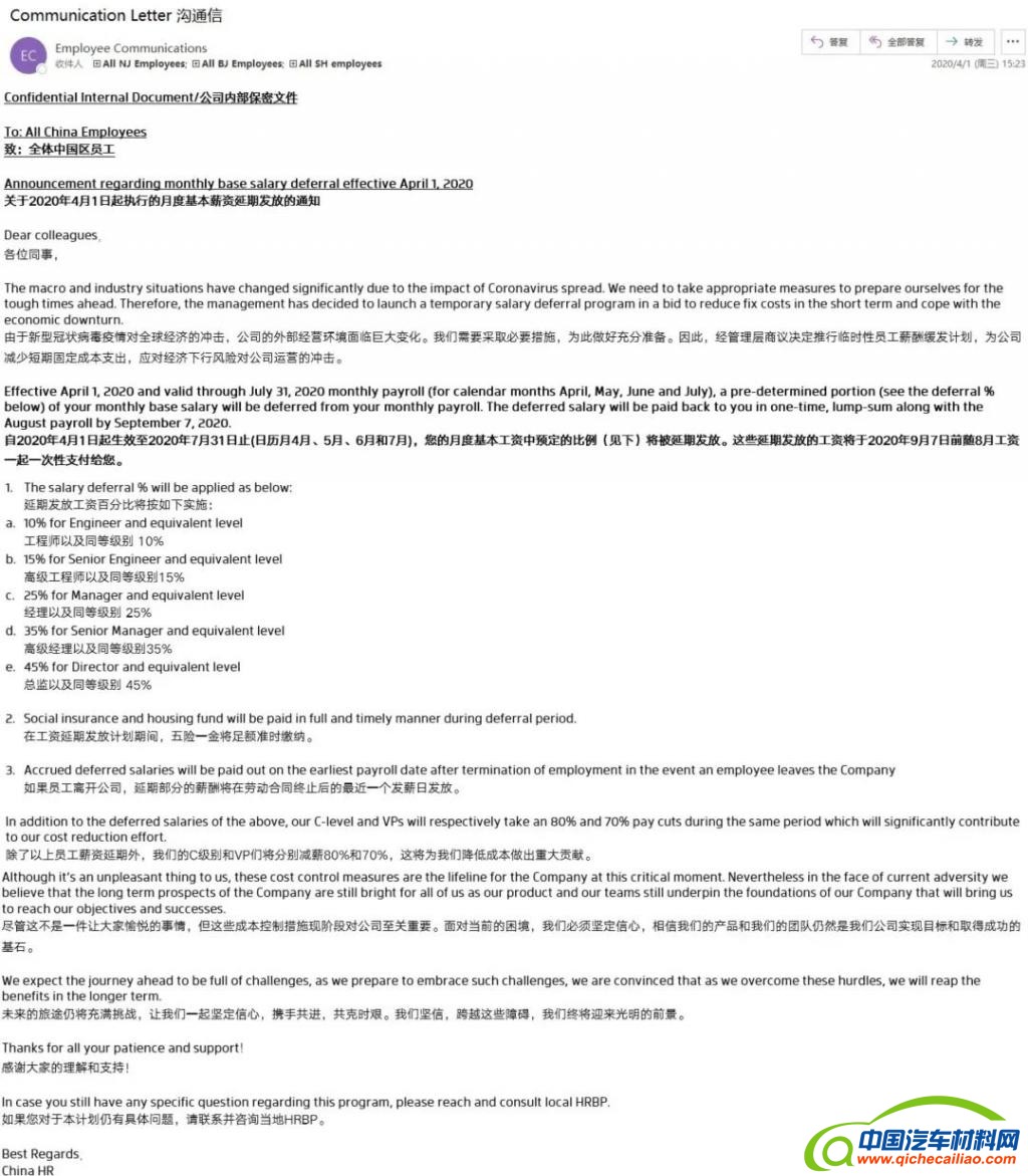 由于经营困难,为降低成本,拜腾汽车曾作出延期发放员工薪资的决定。从一份网曝拜腾汽车 4 月 1 日下发的内部文件显示,拜腾中国区员工 4-7 月的基本工资将按比例被延期发放。该公司称,由于新冠疫情对全球经济的冲击,公司的外部经营环境面临巨大变化,经管理层商议决定推行临时性员工薪酬缓发计划,为公司减少短期固定成本支出,应对经济下行风险对公司运营的冲击。
